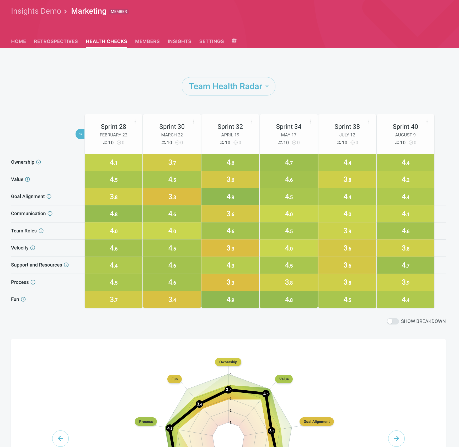 Health checks now allow your team to rate each health dimension 1..n, and will present a radar-style visualization of the results on the discuss and summary pages. Let us know what you think!