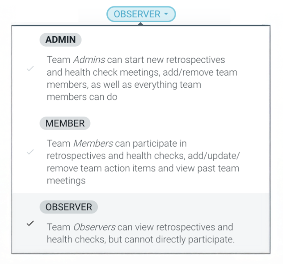 Enterprise customers can now assign users the Team Observer role. Team Observers are automatically invited as non-participating observers to retrospectives and health checks. They can view meeting outcomes, team insights, and trends—without actively contributing—making it ideal for managers, coaches, or stakeholders who need visibility while allowing teams to focus on participation. Team > Members > select “Observer” role.