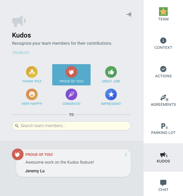 You can now give kudos to your teammates at any time during a meeting via the new Kudos Pane! Celebrate wins, acknowledge effort, and spotlight contributions as they happen. Whether it’s a small success or a major achievement, your team can share appreciation in the moment—helping to create a more positive and motivating meeting environment.