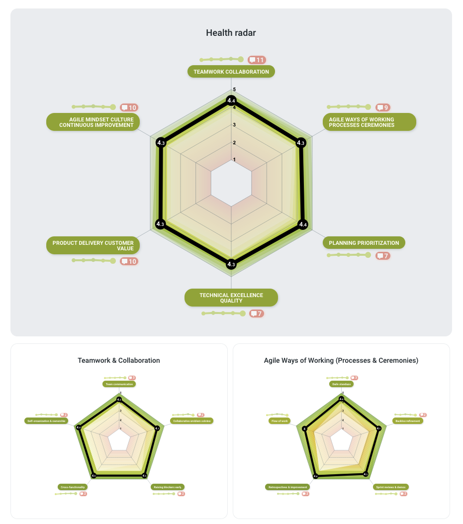 Health check radars now include trend lines for each dimension, helping you visualize how your team’s results have evolved over recent meetings and spark better discussions.