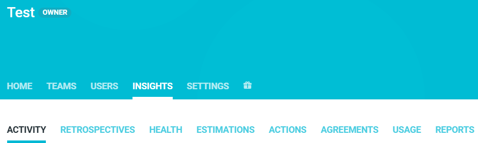 - To see the insights related to the check-in / check-out questions across all teams, simply go to the account HOME page and click on the INSIGHTS tab. From there, click on the RETROPSECTIVES, HEALTH or ESTIMATIONS tab as below: