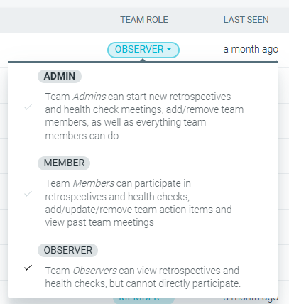 Team Observers are automatically invited as non-participating observers to retrospectives and health checks. They can view meeting outcomes, team insights, and trends—without actively contributing—making it ideal for managers, coaches, or stakeholders who need visibility while allowing teams to focus on participation.