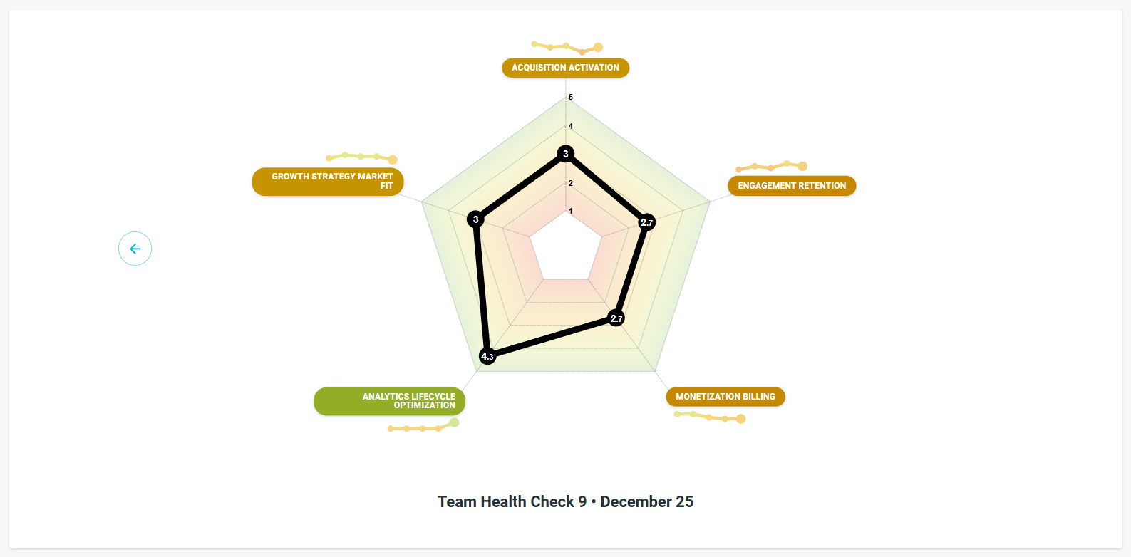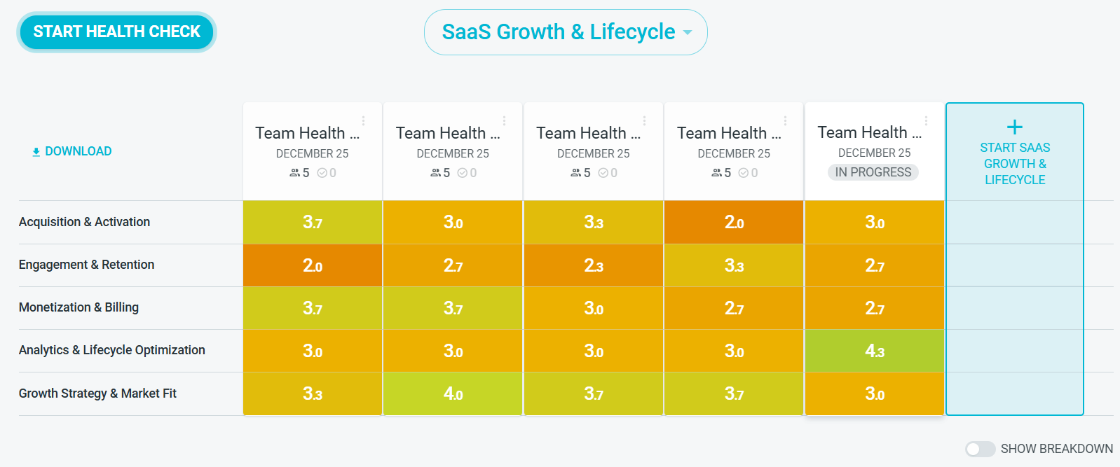 The maturity model health checks facilitate focused discussions about your Agile capabilities, tracking their evolution over time and providing insights into your team's current operational level.