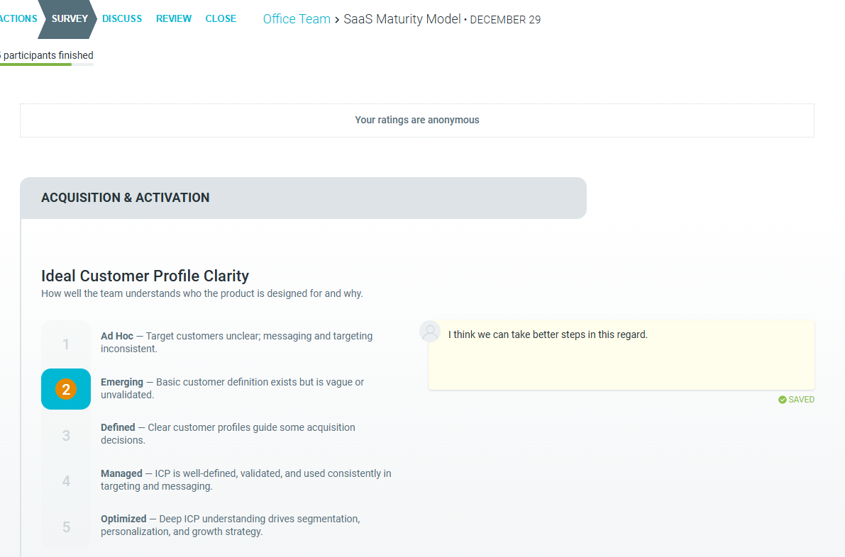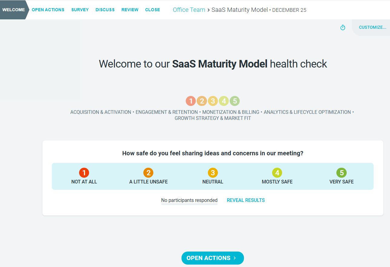 In this step, the facilitator introduces the purpose of the Maturity Model. A short welcome message can help align expectations and explain the meeting flow. Participants will also see a preview of the survey and any important notes or images you choose to share. The facilitator can also include a CHECK IN QUESTION to better gauge participant mood.
