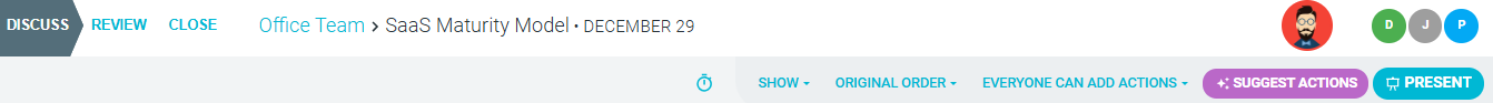 - Facilitators can PRESENT, which will sync each person's screen and discuss the results. Team members can add comments, ideas or action items.