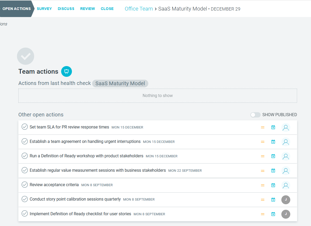 The team reviews the actions identified during the meeting and, optionally, assigns owners and due dates to ensure accountability. This is an opportunity to review actions from previous retrospectives or health checks and update their status. Learn more