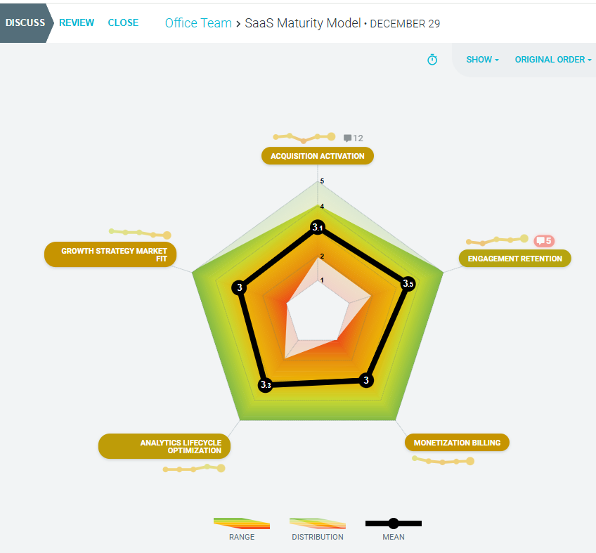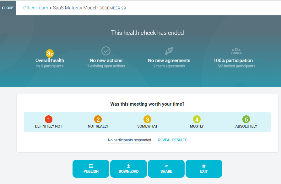 In TeamRetro, you can run maturity models as a structured assessment (similar to a health check) in which participants rate the team across a set of dimensions under a set of categories.