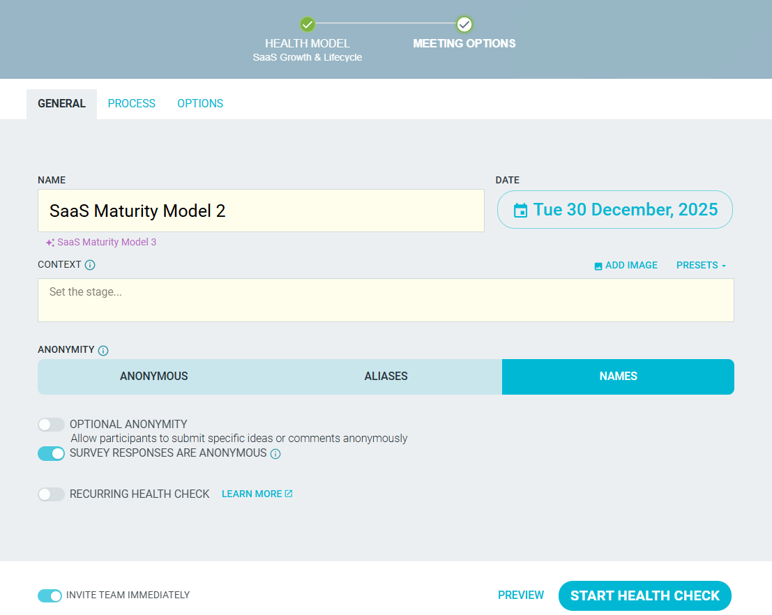 Maturity model dimensions are defined as part of a health model that may be used in multiple health check meetings, allowing you to track changes over time. You can switch or customize your health model via your team page or when setting up your meeting (Learn more).