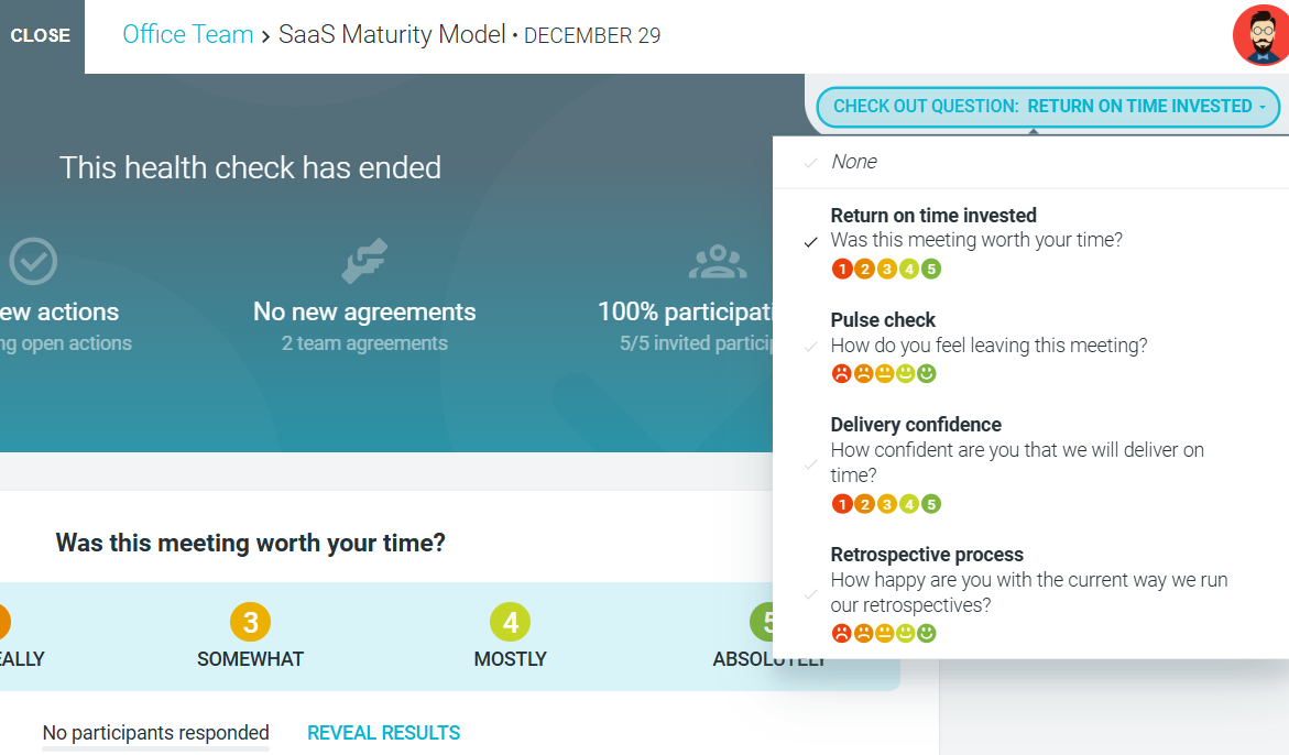 - Use a CHECK OUT QUESTION to gather team reflections at the end of the session. This helps measure how the team felt about the meeting or process. Responses to the question are anonymized, promoting a safe meeting environment for all participants.