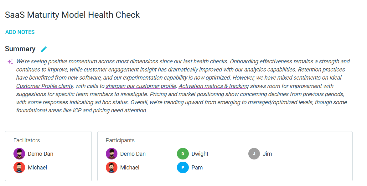 Facilitators can generate a detailed AI-powered summary at the end of the maturity model health check. These summaries include: