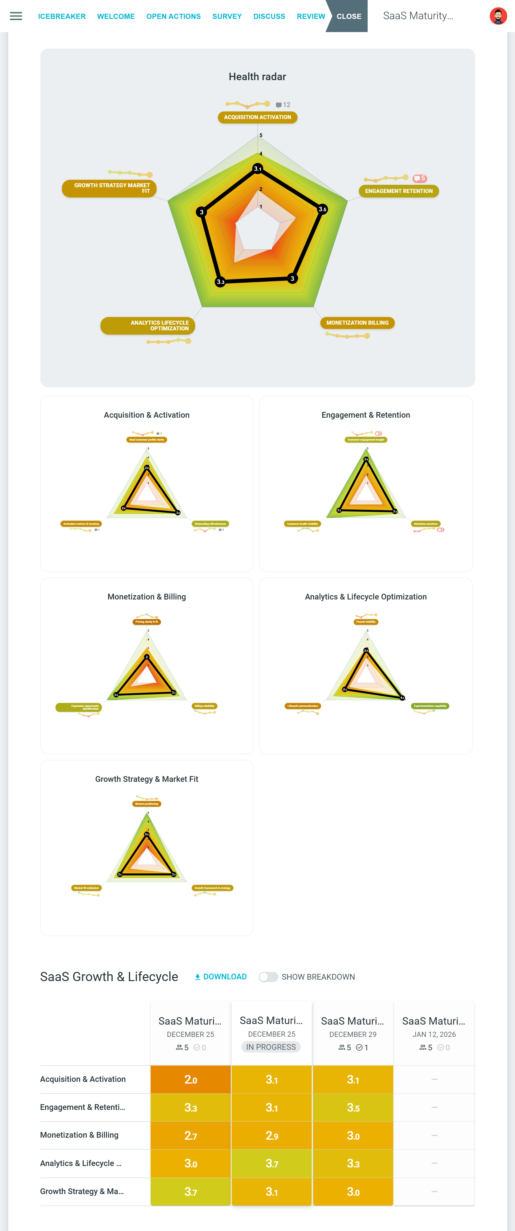 - If you have used this template to run previous maturity model meetings, you will also see a historical trend of how your team is progressing overtime.