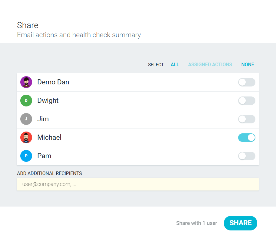 Close your health check with a summary, key metrics and a list of outcomes. You can share the results easily, run a CHECK OUT QUESTION to collect feedback, and generate summaries for reporting and follow-up.