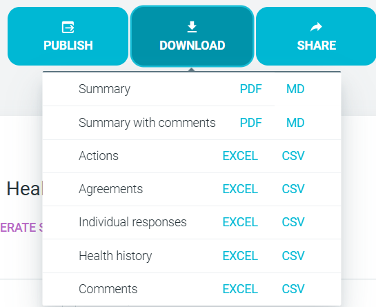 - Click the DOWNLOAD button to export action items and meeting data. You can choose between PDF, MD, CSV or EXCEL formats.