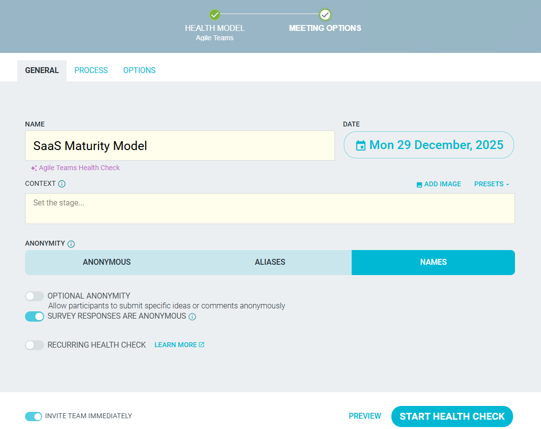 Change the TITLE for your meeting, give CONTEXT to set the stage, and choose your ANONYMITY level.