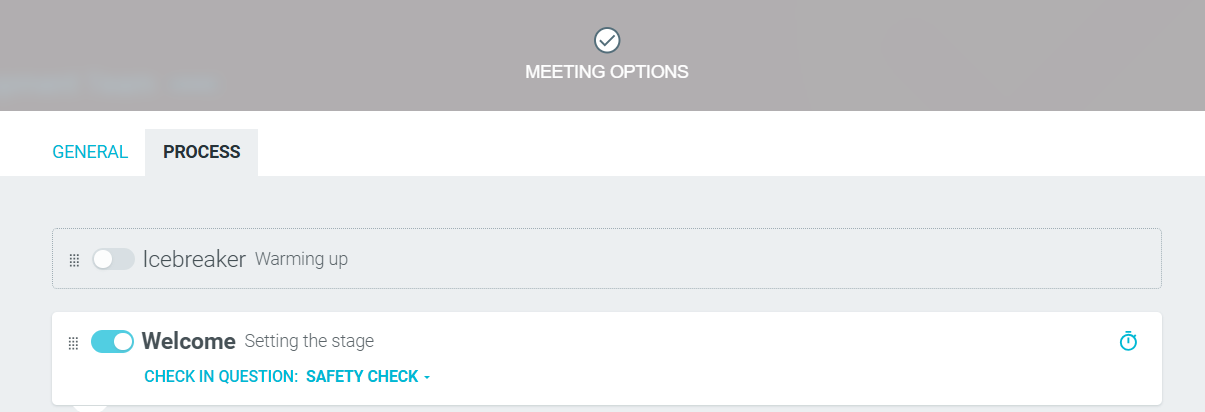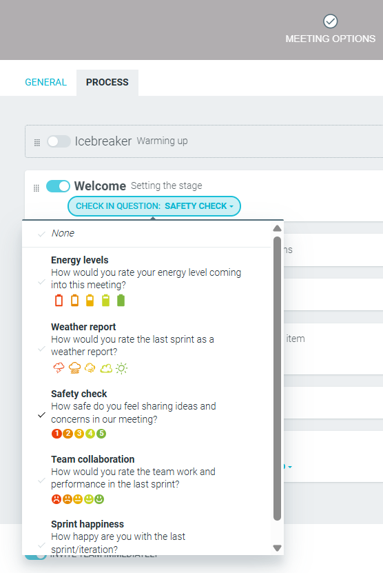 Before you commence the meeting, the WELCOME step helps you share the meeting's focus and themes. You can also get a sense of where the team currently sits by running a check-in question.