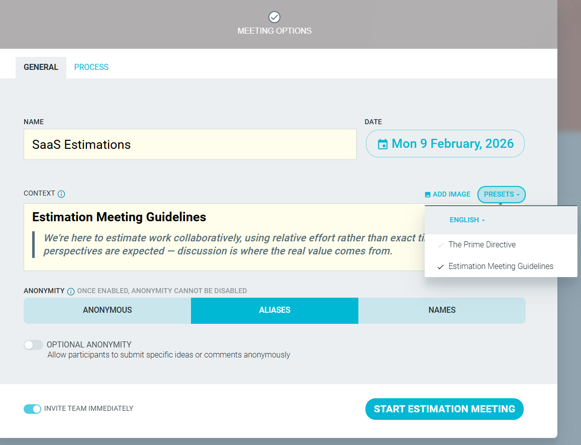 - Add context about the meeting. This can be any text you would like to share. Estimations Meeting Guidelines can also be shown as a default